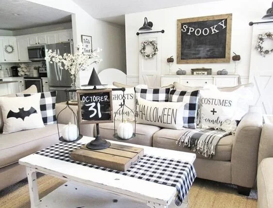 If you are going for the farmhouse theme, if you do not want to add a splash of color, add in decoration that says things that go along with Fall, Thanksgiving or Halloween.