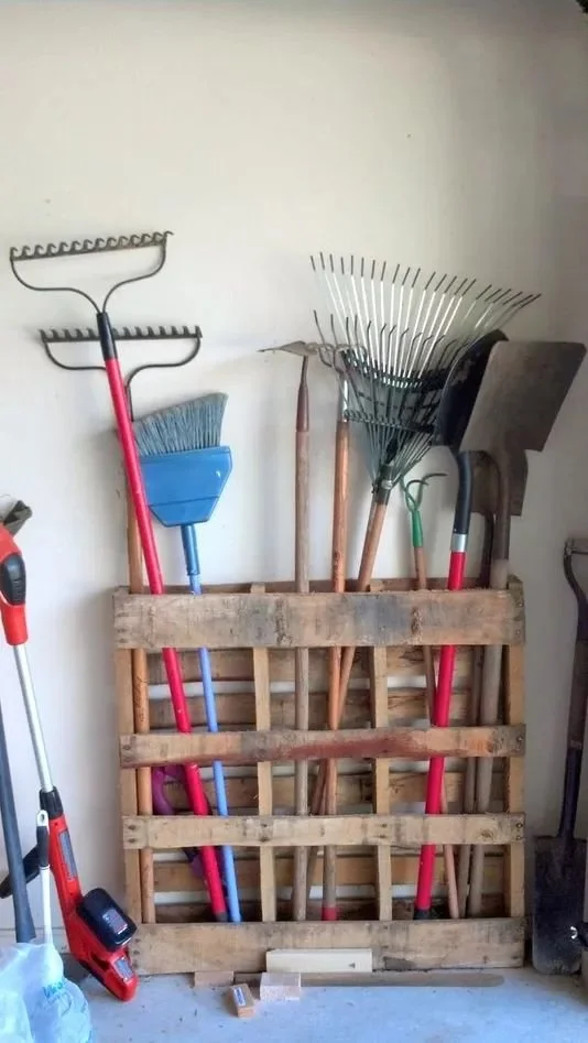 Have an old pallet laying around, waiting to get scrapped? Use it for your organization instead! This is a perfect idea to keep all of your brooms, shovels, and rakes all in one spot instead of leaning them on a wall.