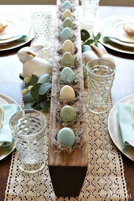 This bright beautiful centerpiece would definitely catch your attention. The eggs can be dyed yourself, or you can buy fake ones. This is a perfect small but festive piece.