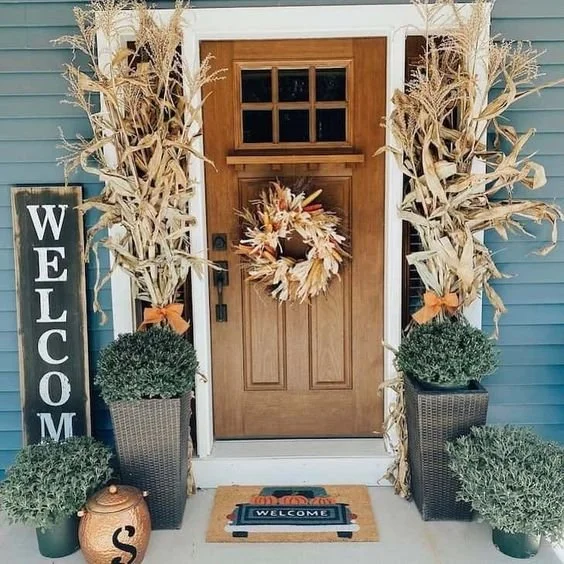 Create harvest-inspired displays with items like hay bales, cornstalks, and rustic crates. These elements can be strategically placed around your porch or entryway to enhance the fall aesthetic.