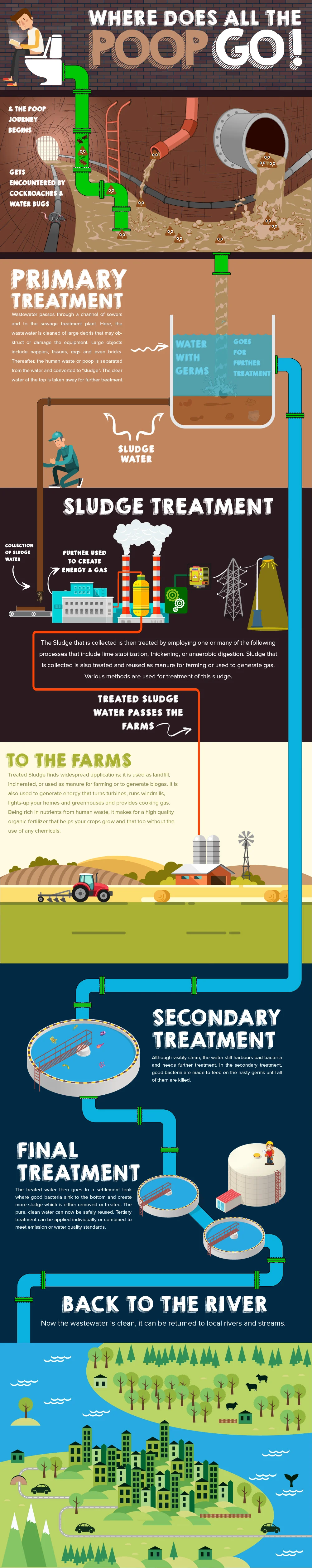 Within the sewage systems that carry away the poop, it meets water bugs, cockroaches, chemicals and other pollutants. It then flows and reaches a sewage treatment plant. After removing large debris such as nappies, tissues, cloth pieces, pebbles, etc. the human waste is separated from the water. The resulting sludge goes into further treatment using processes such as lime stabilization, thickening and anaerobic digestion. The sludge is then used as fertilizer or fuel as it is rich in micro-nutrients. The water, on the other hand, needs secondary treatment to remove the harmful bacteria using good bacteria and chemicals. The pure, clean water can be reused safely or can be simply released back to the rivers or seas.  Here, is an animated infographic explaining the whole process of where does the Human Waste go?