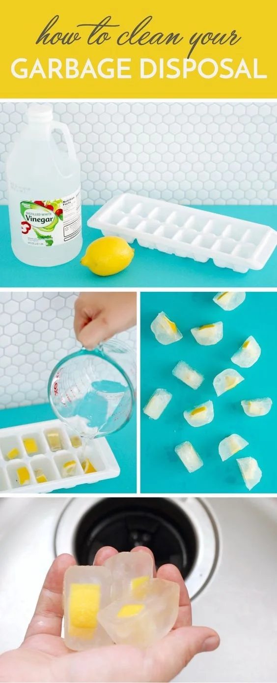 NEXT, SLICE UP A LEMON, AND A CUP OF ICE. PUT IT DOWN THE GARBAGE DISPOSAL. TURN ON THE GARBAGE DISPOSAL AND LET IT GRIND.